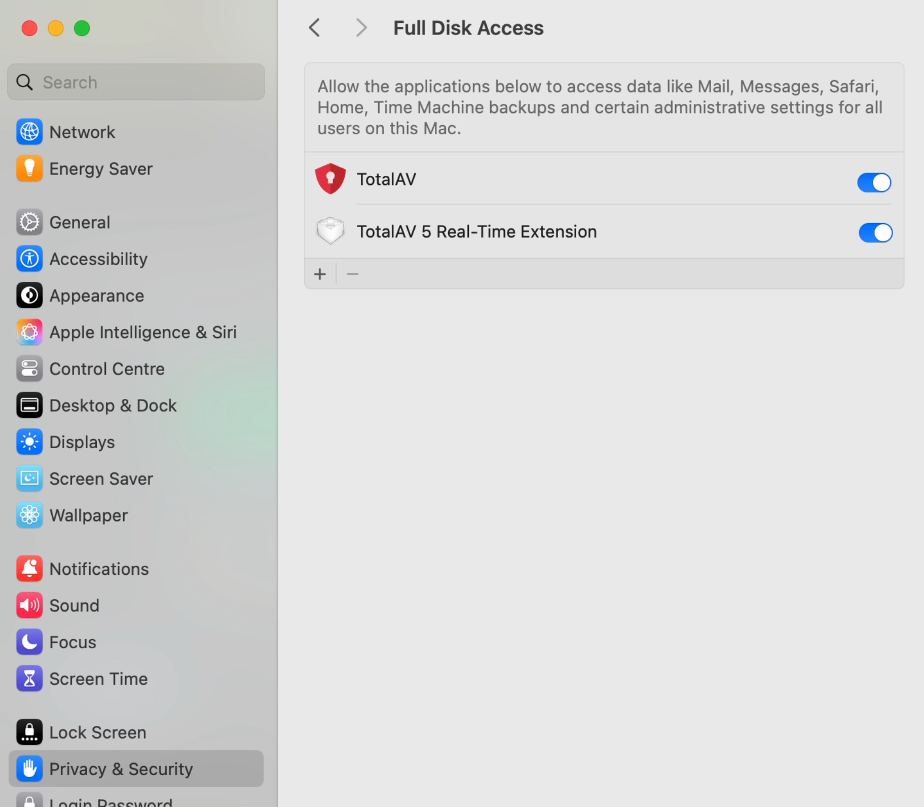• Se habilitó TotalAV para tener Acceso completo al disco haciendo clic en el botón de alternancia.