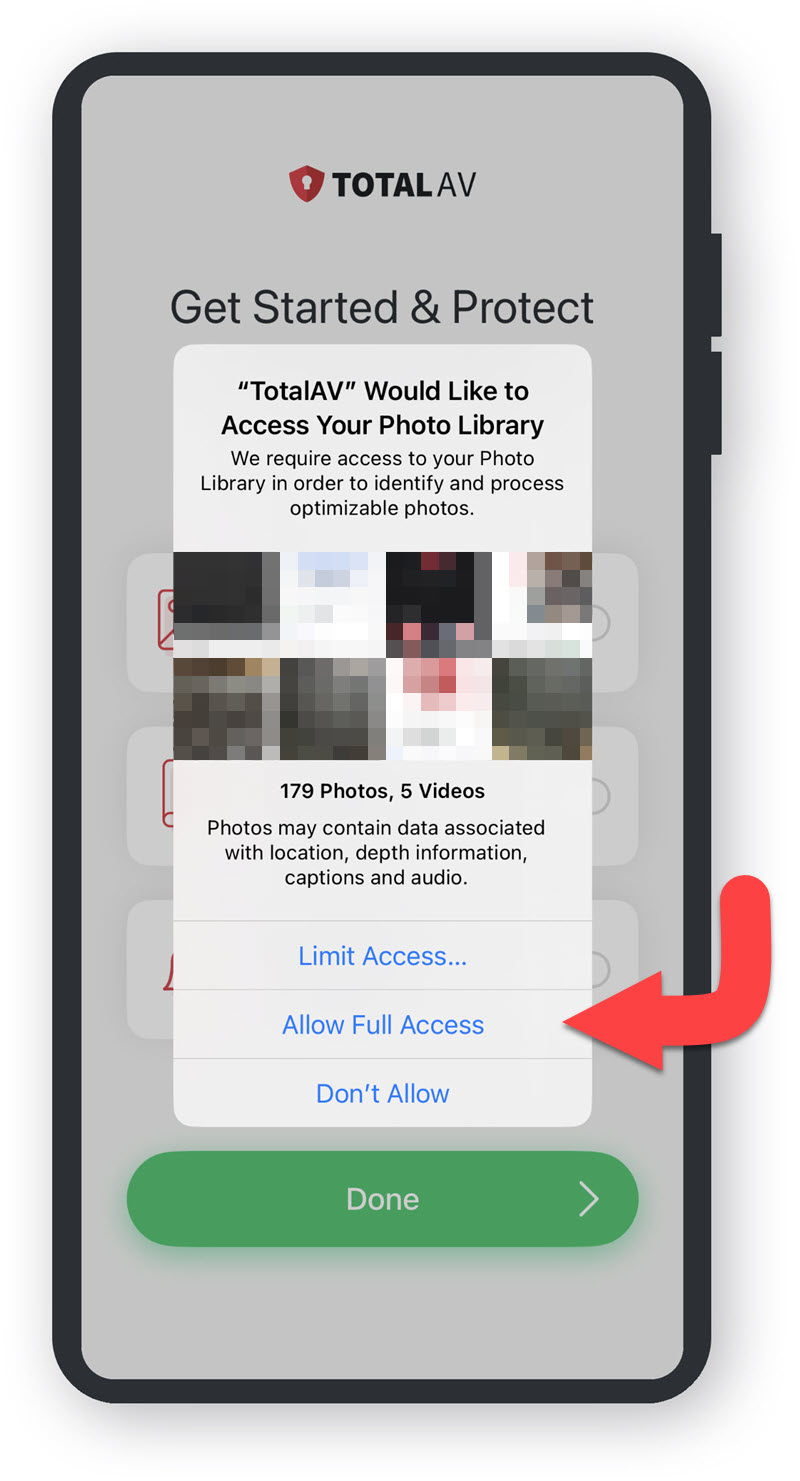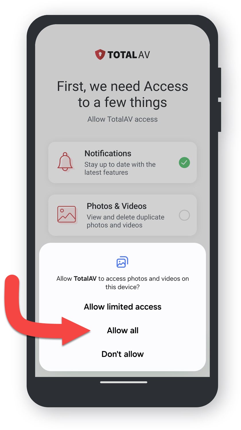 • Pulsa Permitir todo para que TotalAV tenga acceso a tus fotos y vídeos. Si no quieres que TotalAV tenga acceso total, pulsa Permitir acceso limitado.