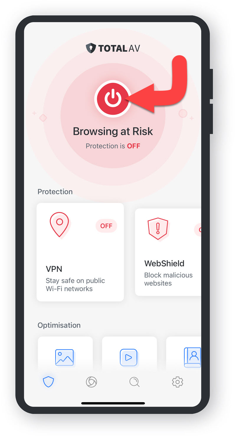 • Toque el ícono Encendido para comenzar la activación de TotalAV Webshield.