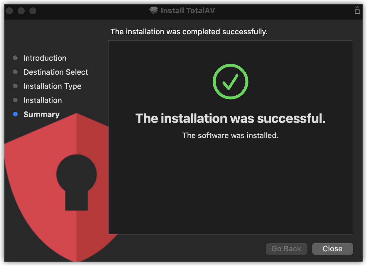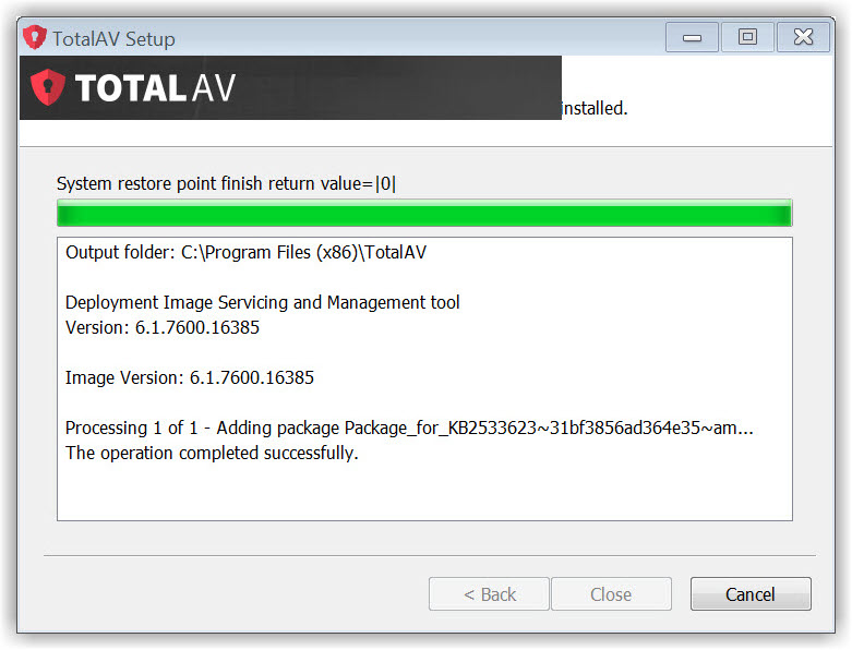 Haga clic en Cerrar para continuar con la aplicación TotalAV.