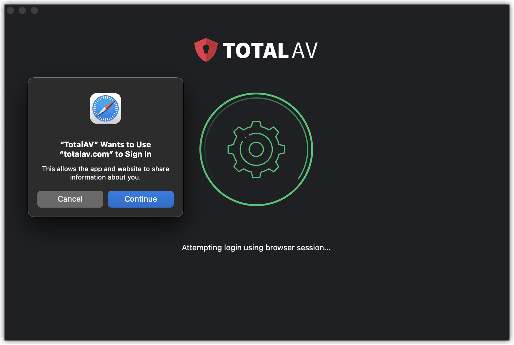 TotalAV intentará iniciar sesión con su navegador actual. Haga clic en Continuar. Si no lo logra, siga el siguiente paso.