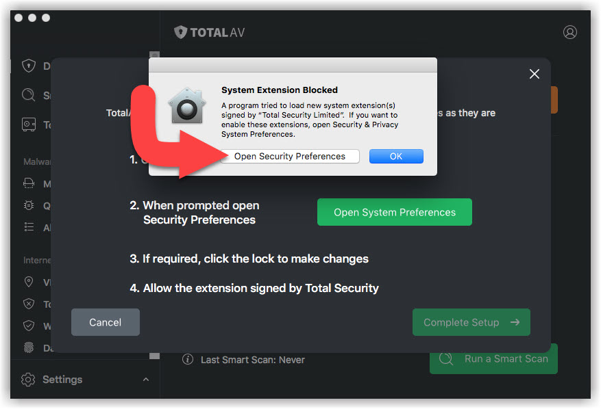 • Vaya a la aplicación TotalAV y haga clic en Completar configuración.
