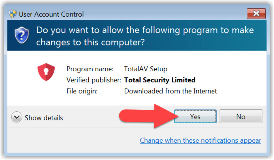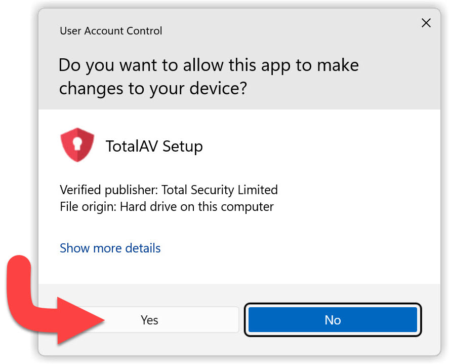 A continuación, haga clic en para permitir que TotalAV comience la instalación. Sin aprobación, TotalAV no podrá instalarse en su dispositivo.
